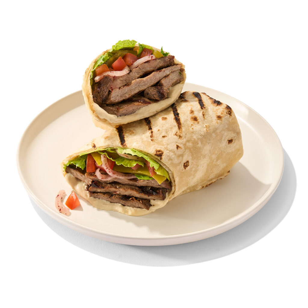 Shish Kebab with tomatoes, onions, lettuce, pickles, spread with hummus and topped with tahini.