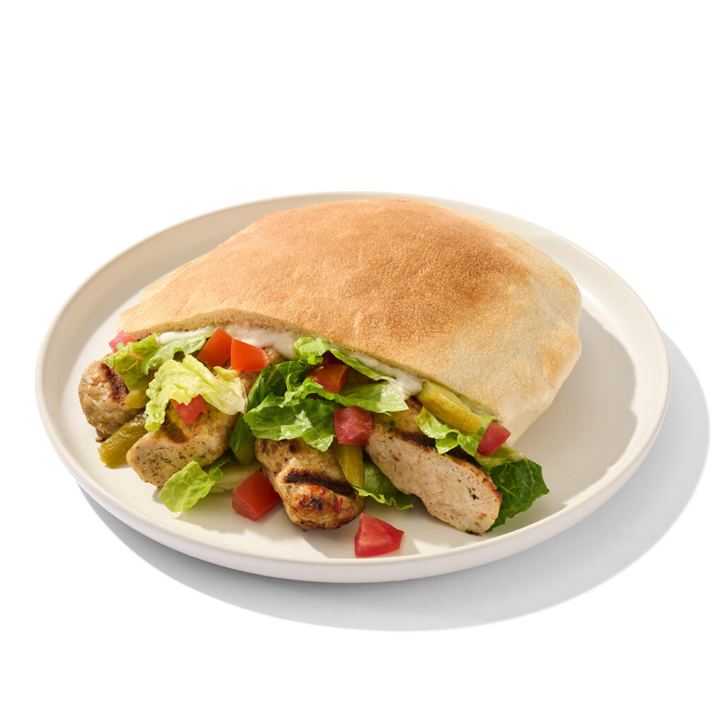 Chicken Kufta Kebab Chicken Kufta Kebab with tomatoes, lettuce, pickles, spread with a garlic sauce and topped with tahini.