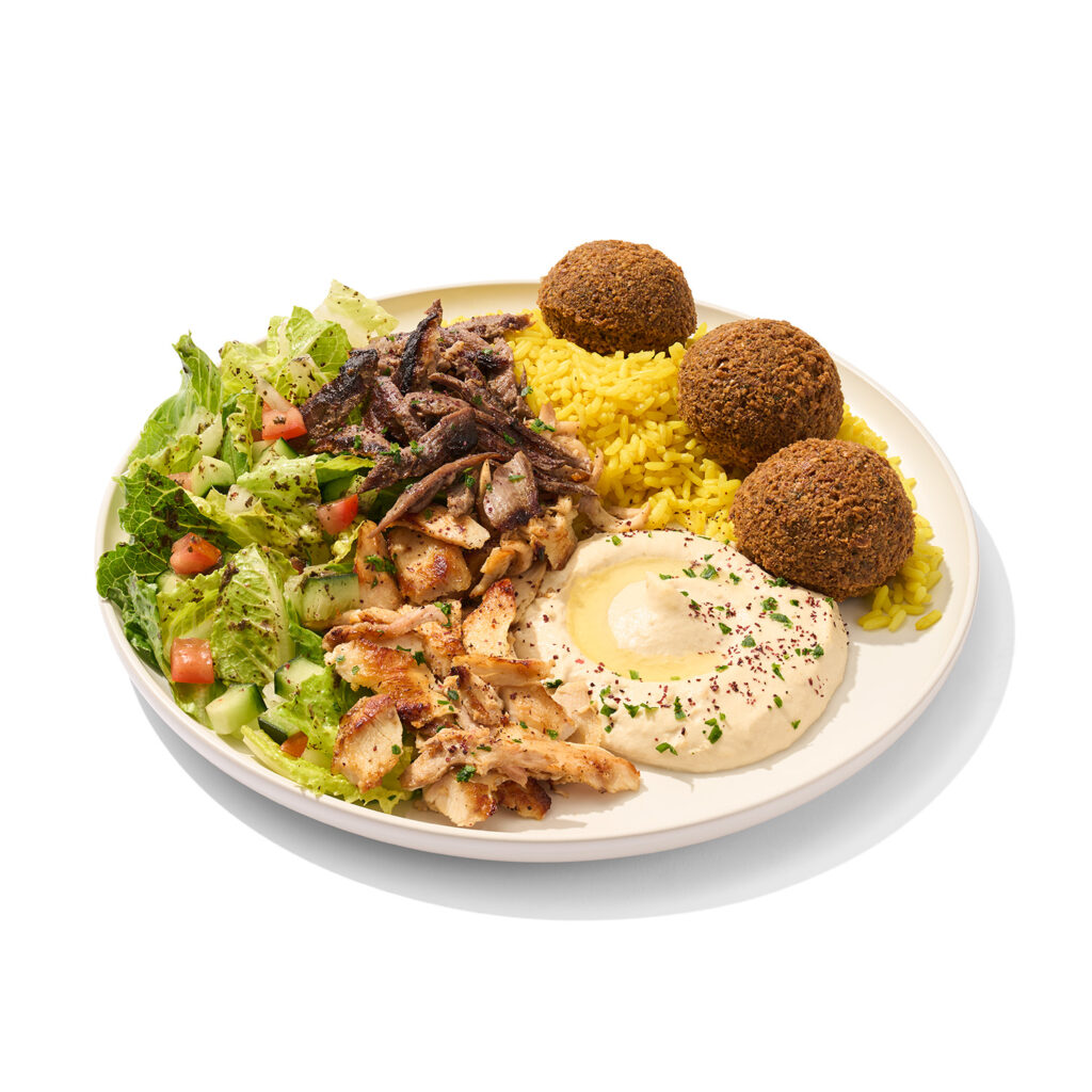 Meat & Veggie Chicken and Beef Shawarma, Hummus, (3) Falafel, Arabic Salad, topped with a pinch of sumac and rice.